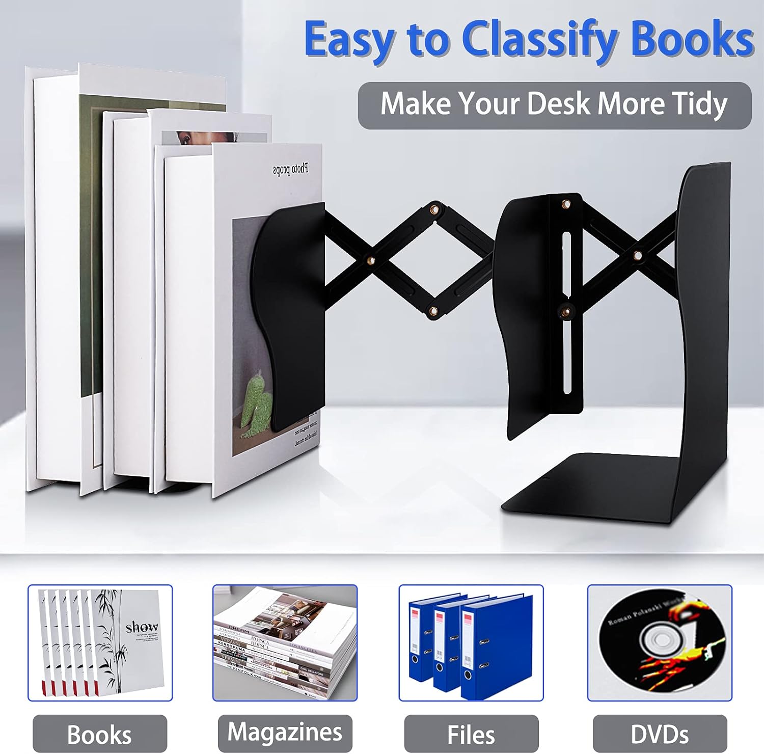 Non Skid Book Ends to Hold Books, Carooyac Metal Adjustable Book Ends Decorative Bookends for Home Office, Heavy Duty Kids Bookshelf Magazine Holder Book Organizer for Desk